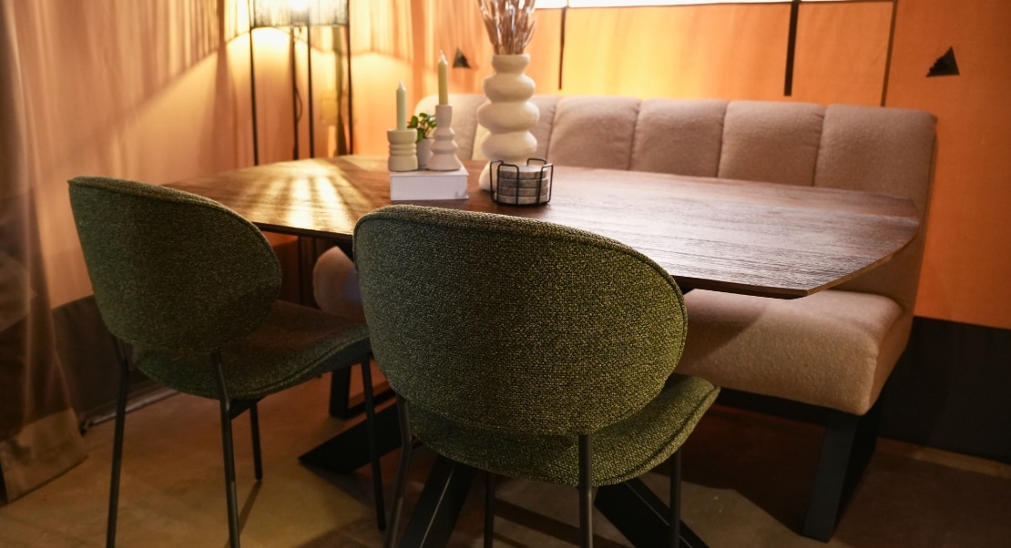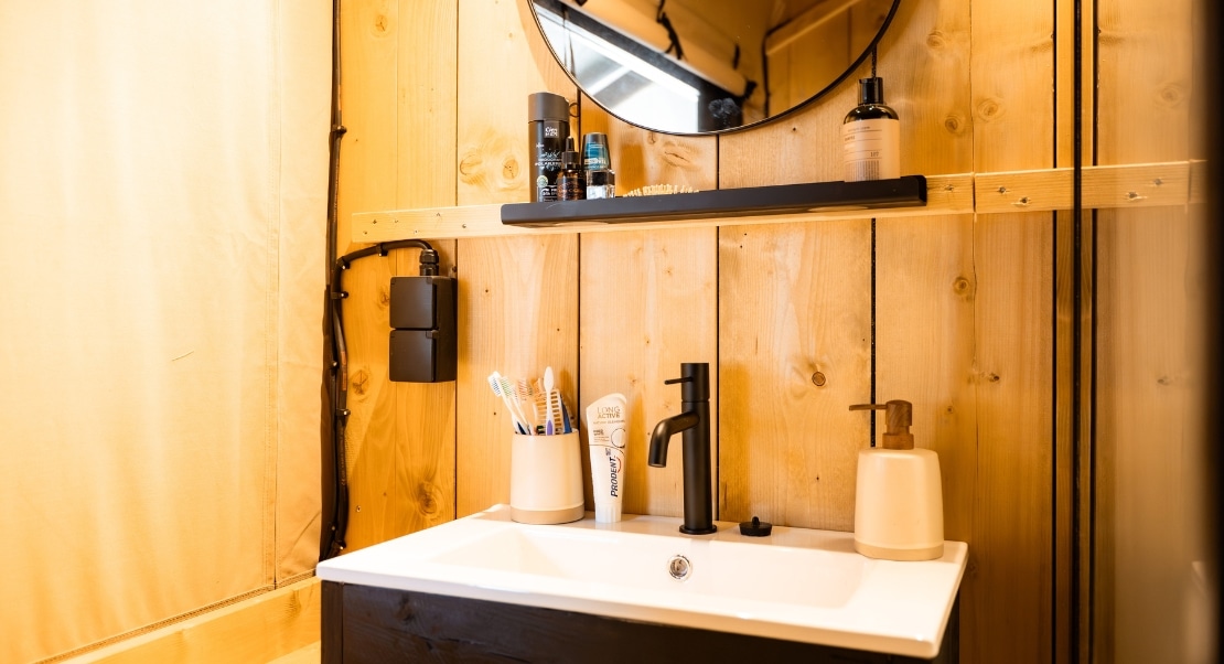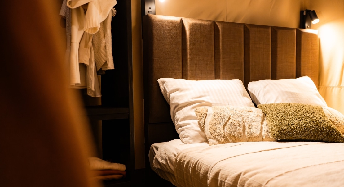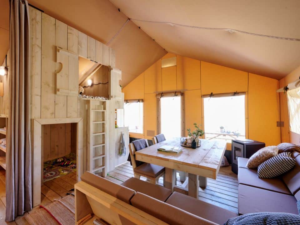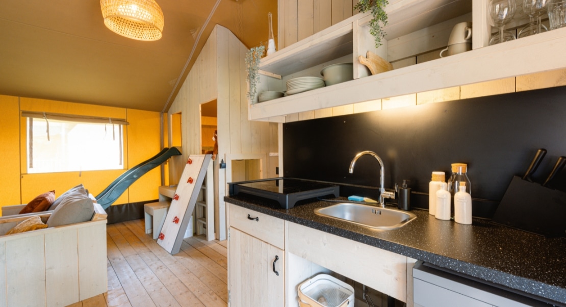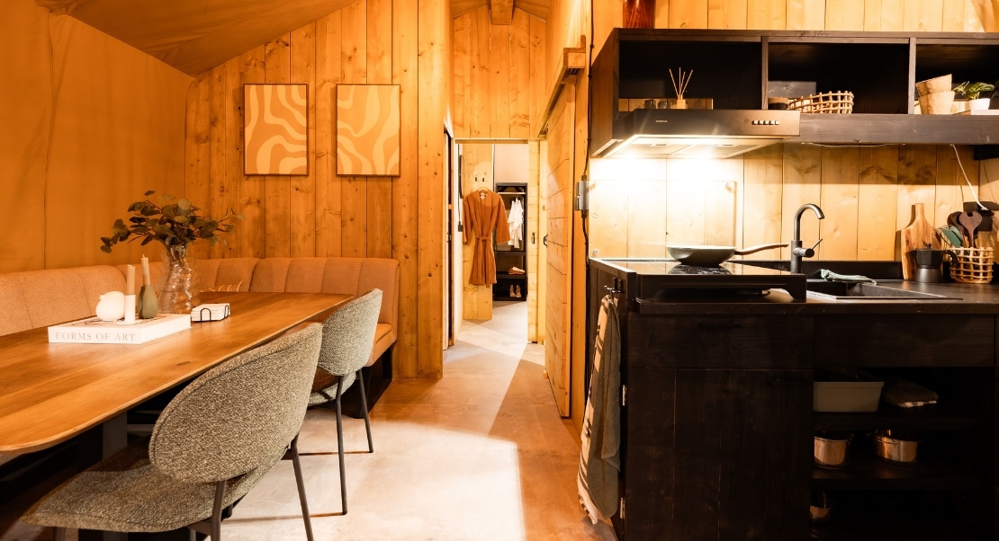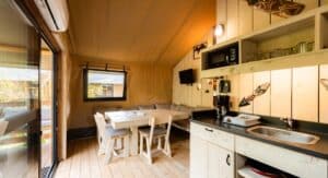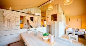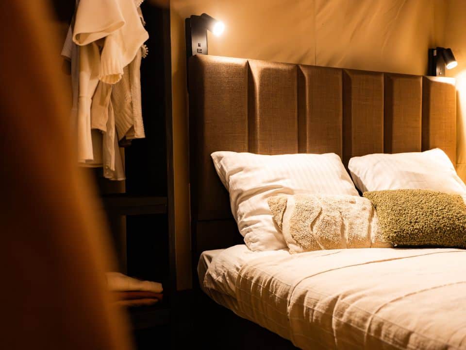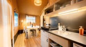 Nous fournissons l’ensemble de l’aménagement : salles de bains, kits d’accessoires, matelas, coussins et même lave-vaisselle. Votre tente est prête à accueillir vos clients ; il ne vous reste qu’à ajouter quelques touches personnelles.