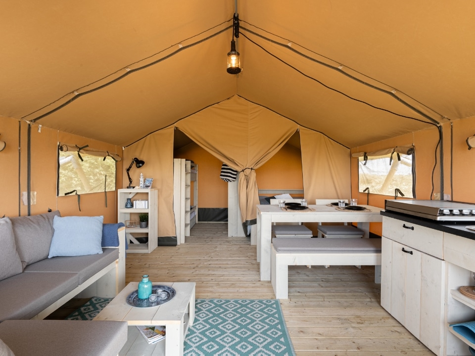Vous recherchez une tente de glamping qui soit à la fois compacte et luxueuse ? Notre tente safari Compact porte bien son nom. Elle dispose de toutes les nécessités pour camper dans le luxe : une cuisine, des chambres à coucher et une terrasse. Cette tente est certes un peu plus étroite et moins haute, mais semble néanmoins assez vaste grâce aux grandes fenêtres sur la façade avant.