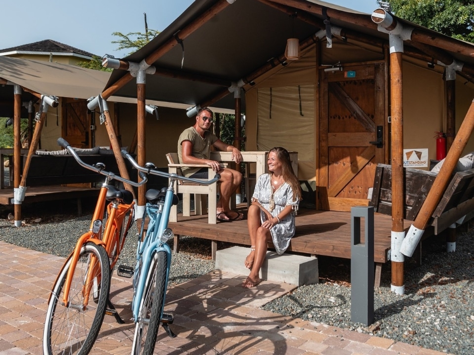 En termes de dimensions, cette tente se situe exactement entre la tente safari Compact et la XS. La tente safari Fellow a été conçue pour répondre à une demande spécifique : un modèle compact convenant pour de petits emplacements tout en offrant un espace de vie optimisé. Vous pouvez également choisir d’équiper la tente safari Fellow d’un salon, d’une cuisine et/ou d’une salle de bain. La tente dispose d’un vaste espace de couchage. La grande terrasse couverte devant la tente permet à vos vacanciers de profiter des douces soirées d’été.